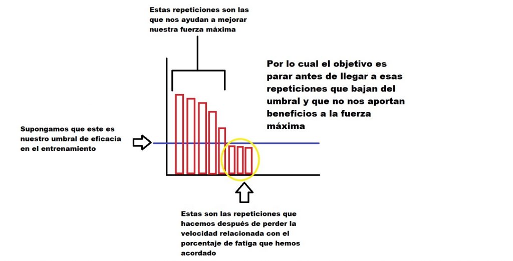 Cuando empecemos el primer día, calentamos, nos preparamos y hacemos unas repeticiones para medir el 1 RM y comenzamos con la parte principal: de ese 1 RM que hemos calculado nos colocamos el 70% de la carga, a continuación vais a tener que grabaros en video en cada repetición, para medir la velocidad a la que levantáis la carga, siempre hacerlo con la mayor velocidad posible, haremos solo 1 repetición en cada serie. La pregunta es: ¿Cuántas series haremos? Bien la respuesta es muy fácil, tantas como podamos hacer hasta que perdamos un 12 % de la velocidad.